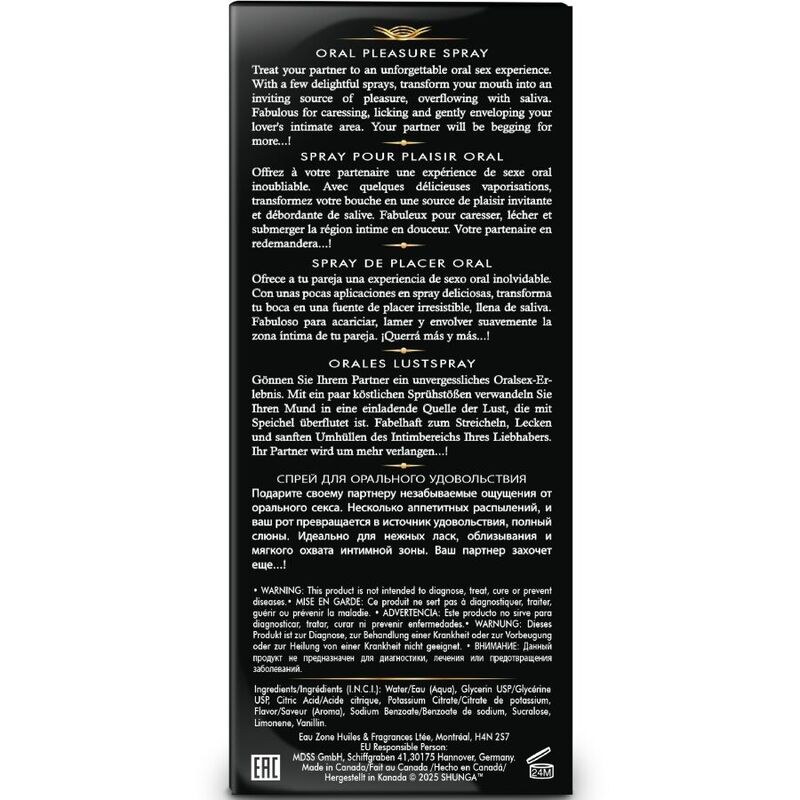 Descubre una nueva forma de disfrutar el juego oral con este spray diseñado para elevar la experiencia a otro nivel. Con solo unas pulverizaciones, tu boca adquiere una textura más suave y húmeda, perfecta para deslizarse con sensualidad por cada rincón íntimo de tu pareja. Sus deliciosos sabores despiertan los sentidos y convierten cada beso, cada lamida y cada roce en un estímulo irresistible que aumenta el deseo de manera natural.