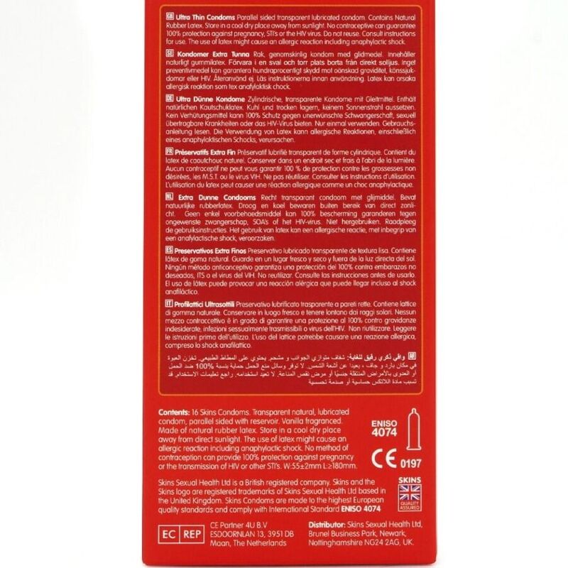 Presentamos el Skins Ultra Thin 16-Pack: un producto económico y listo para usar que ofrece hasta un 33 % más de condones por paquete que el líder del mercado. Diseñado para clientes que buscan la máxima intimidad con protección confiable, este paquete es ideal para tiendas que buscan un producto esencial premium y de alto rendimiento. Los condones Skins Ultra Thin ofrecen todas las ventajas de Skins Natural, pero con un diseño aún más fino para una mayor sensación de intimidad. Fabricados con látex natural de primera calidad, ofrecen resistencia, transparencia y una sensación de segunda piel, lo que los convierte en la opción ideal para quienes priorizan la sensación. Siéntete aún más cerca de tu pareja con el condón Skins Ultra Thin, resistente pero increíblemente fino. Con todas las características de Skins Natural, pero aún más fino, usar un Skins Ultra Thin es tan parecido a una segunda piel.