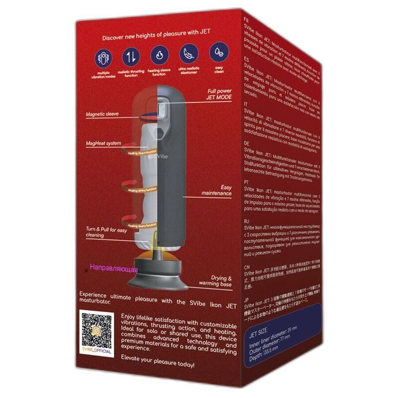 El SVibe Ikon JET incorpora una base calefactable que imita el calor corporal, elevando el nivel de realismo y aportando una sensación más natural e inmersiva. Además, esta base cuenta con función de secado, facilitando el mantenimiento del dispositivo y asegurando una higiene óptima tras cada uso.